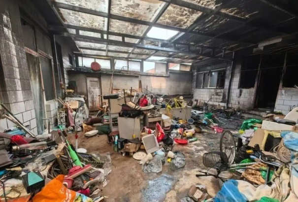 正房呈现中间客厅烧毁严重,东西两侧卧室烧损较轻(烟熏)的状态。中间客厅石膏板吊顶散落到地面,客厅东西两侧各放置一个沙发,客厅北侧为木柜,两个沙发及木柜均烧失。西侧沙发烧损程度高于东侧沙发,西侧沙发燃烧仅剩部分弹簧部件,西侧沙发西南侧弹簧部分烧损缺失,距西墙50cm处形成一处10cm*10cm碳坑。